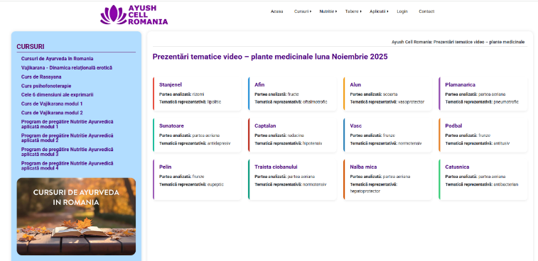 Pagina include detalii clare privind modalitatea de accesare, înscriere și participare, precum și informații despre costul fiecărei înregistrări și durata accesului. Această structurare permite integrarea facilă a studiului tradiției ayurvedice în programul personal al celor interesați de aprofundarea istoriei și doctrinei Ayurvedei.