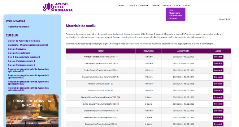 Cursurile scrise și materialele de studiu în format PDF sunt disponibile prin intermediul paginii dedicate ayushcell.ro/suport_scris