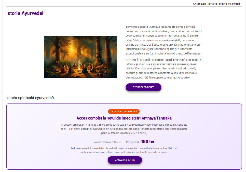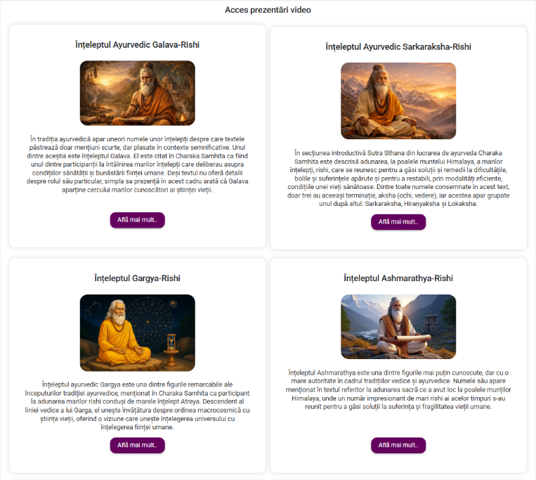 Pagina dedicată istoriei Ayurvedei din platforma ayushcell.ro este configurată ca o aplicație educațională digitală specializată, care oferă acces facil, rapid și structurat la un set extins de prezentări video dedicate istoriei și tradiției ayurvedice.