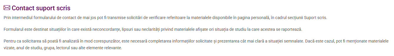 Secțiunea „Contact suport scris” are rolul de a facilita transmiterea clară și completă a solicitărilor referitoare la materialele educaționale afișate în pagina personală. Această casetă de dialog reprezintă un instrument practic de comunicare și de verificare, util pentru gestionarea situațiilor care necesită clarificări privind suportul scris.