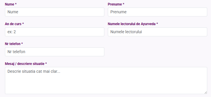 Elementul central al formularului este câmpul „Mesaj / descriere situație”. Aici utilizatorul are posibilitatea de a descrie cât mai clar problema. Din punct de vedere practic, acesta este spațiul în care este necesar să fie menționate informațiile esențiale: ce material este vizat, unde ar fi trebuit să apară, ce neconcordanță a fost observată față de precizările din Ayurveda Agenda, la ce nivel de studiu sau la ce grupă se face referire și orice alt detaliu care poate fi de folos. Cu cât descrierea este mai concretă, cu atât solicitarea poate fi analizată mai repede și mai precis.