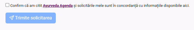 Caseta de confirmare de la final are rol de verificare. Prin bifarea acesteia, utilizatorul confirmă că a consultat informațiile relevante din Ayurveda Agenda și că solicitarea transmisă este formulată în acord cu datele disponibile acolo. Din punct de vedere funcțional, această etapă ajută la evitarea sesizărilor formulate înainte de verificarea surselor deja publicate și contribuie la o mai bună filtrare a solicitărilor care chiar necesită intervenție.